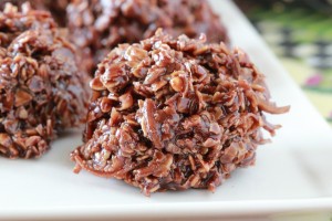 [3] Remove the pan from the heat. In a medium bowl, whisk together the oats, coconut, cocoa, and salt until blended. Working quickly with a spatula, stir the oat until mixture into the saucepan until thoroughly combined. Stir in the vanilla. Drop by heaping tablespoons (or a #30 metal spring-action ice cream scoop) on the wax paper. The cookies will be quite soft, but will firm up as they cool to room temperature. Store in an airtight container for up 2 days. Makes 12 cookies.