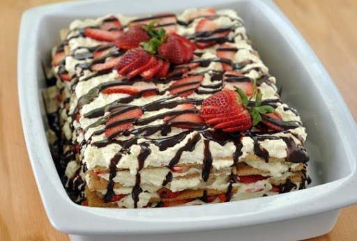 Spread a small spoonful of whipped cream on the bottom of a 9x13 inch baking pan, or a similarly-sized platter. Lay down six graham crackers. Lightly cover the top of the graham crackers with more whipped cream, and then a single layer of strawberries. Repeat three times, until you have four layers of graham crackers. Spread the last of the whipped cream over the top and swirl it lightly with a spoon. Add a few more strawberries.