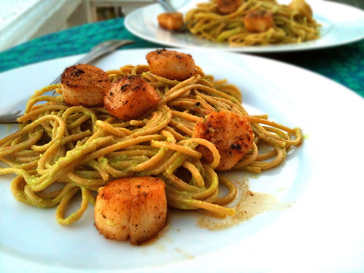 Heat heavy saucepan over medium heat. Add butter and heat, stirring occasionally, until it begins to brown, about 6 minutes. Add garlic and cook 1 minute. Stir in remaining 2 tablespoons lemon juice. Serve scallops over portions of hot cooked spaghetti and spoon sauce over scallops.