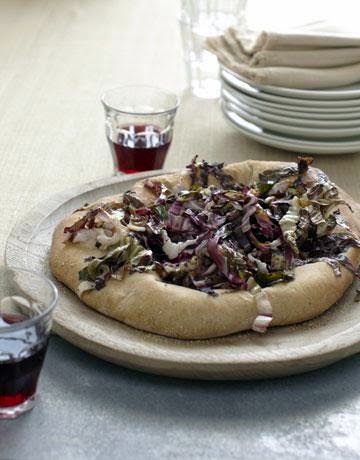 5. Scatter the dressed radicchio over the pizza crust and return to the oven for another 3 to 5 minutes, until the radicchio is warm and just starting to wilt. Serve immediately.