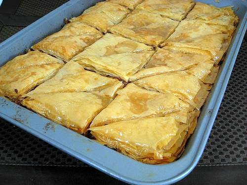 Grease a 9×13 pan, and place one layer of phyllo at the bottom. Brush the phyllo with the melted butter, and then add another layer of phyllo, and brush with more butter. Continue this process until you have layered about 7 sheets of phyllo.