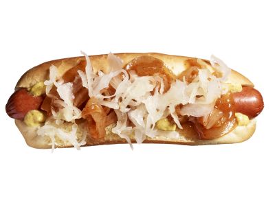 Heat 2 tablespoons vegetable oil in a saucepan over medium heat. Add 2 thinly sliced onions and cook, stirring, until soft, about 8 minutes. Stir in 2 tablespoons honey and 1/2 teaspoon each ground cinnamon and chili powder; cook 1 minute. Add 1/2 cup water, 1/4 cup ketchup, 1 teaspoon hot sauce, 1/2 teaspoon kosher salt and 1/4 teaspoon pepper. Simmer until thickened, 10 to 15 minutes. Serve with Spicy Mustard and Sauerkraut.