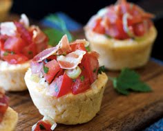 Cheddar Cups with Fresh Tomato Relish & Crispy Pancetta