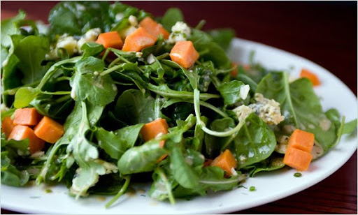 4. Place the salad greens in a salad bowl and top with the cheese. Toss with the dressing. Sprinkle on the sweet potato croutons and serve.