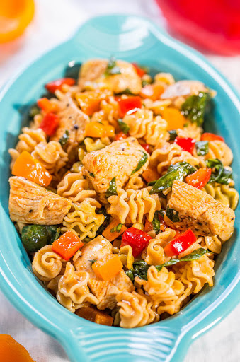 Add the spinach, peppers, chicken and all the sauce to the bowl of pasta and stir well to combine. Taste and check for seasoning balance, making any necessary adjustments. Dish can be served warm immediately or can be served as a cold pasta salad. Will keep airtight in the fridge for up to 4 days. Serve cold or reheat gently prior to serving if desired.