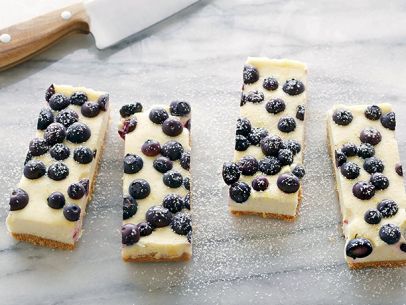 Bake in the oven for 35 minutes or until the center only slightly jiggles. Remove from the oven and cool completely before refrigerating for at least 3 hours. Once set, remove from pan using the parchment lining and slice into 10 rectangular bars. Dust with powdered sugar.