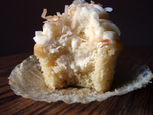 To fill the cupcakes. carve out a cone-shaped hole (forget donut holes - I'm marketing cake holes!) and carefully spoon the coconut pastry cream inside. Apply frosting generously to the cupcakes. sprinkle the tops with toasted coconut, and after giving the components a few minutes to get to know each other, devour.