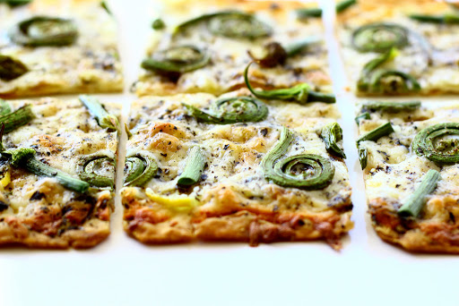 Boil 1 quart of water. Add 1 tsp of salt to water. Boil fiddleheads for 8 minutes or until tender. Drain and plunge into ice water to stop cooking. Drain again and towel dry. Store in a wrapped up towel in the fridge until you are ready to make the pizza.
