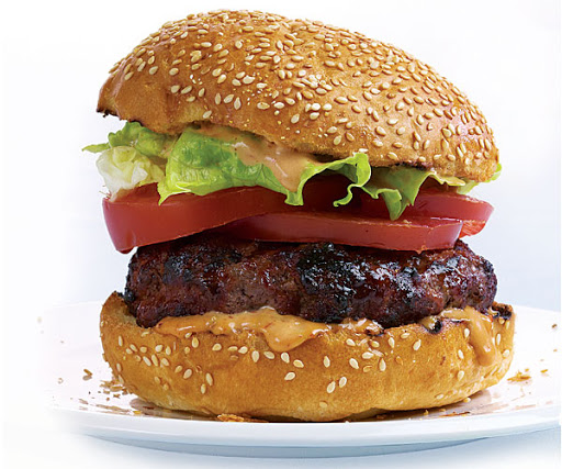 While the burgers cook, toast the rolls on the grill. Spread some of the dressing on each half of the roll and arrange a lettuce leaf and a slice or two of tomato on the top halves. When the burgers are done, put them on the bottom halves. Assemble the sandwiches, cut in half if you like, and serve.