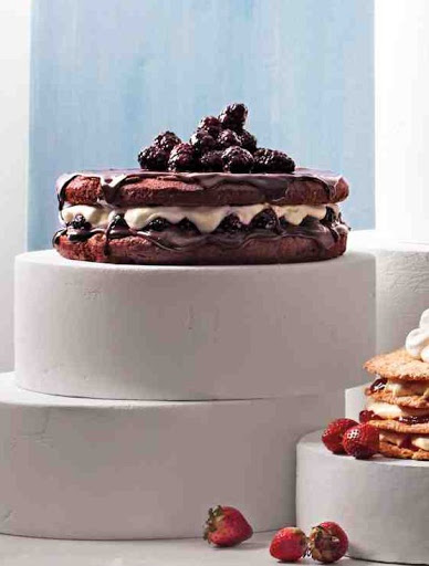 Our version of the German specialty is wonderfully left to the elements, rather than shrouded in whipped cream and chocolate shavings. Tow layers of chocolate sponge cake (or genoise) -- brushed with a creme de cassis syrup – sandwich chocolate-ganache glaze, whipped cream, and fresh blackberries (a no-pitting-required swap for cherries). The toppings? More ganache glaze and a pile of berries.