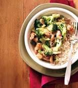 4. Add the remaining 2 tablespoons olive oil to the skillet and heat until hot. Add the chicken mixture and scallion whites and cook, stirring, until the chicken is just cooked through, about 2 minutes. Stir in the broccoli, then stir in the remaining cornstarch mixture. Cook until the liquid thickens, about 30 seconds. Remove from the heat and stir in the scallion greens. Serve with the rice.