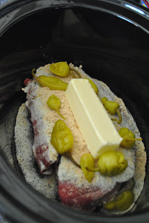 Put roast in crock pot. Sprinkle ranch mix and gravy mix on top. Add butter and place the peppers around it on top of the meat. Cook on low 8-10 hours.