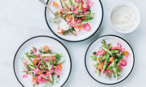 Divide salmon, pickled cucumber, and pickled red onion among plates. Top with dill and parsley sprigs; season with pepper. Serve with horseradish cream alongside.
