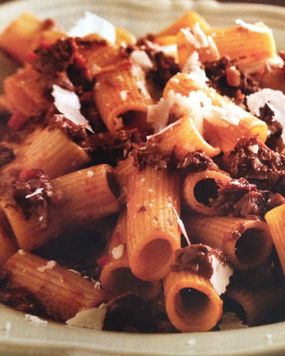 Heat the oil in saute pan over medium high heat. Add the pancetta, celery, carrot, onion and 1 tsp salt; cook, stirring frequently until vegetables are soft and lightly golden. Add garlic and cook 1 minute. Add the brisket and its juices, wine, thyme and the porcini and their soaking liquid. Bring to a simmer and reduce to low. Cook until the sauce is thick, about 30 minutes. Season with salt and pepper to taste.