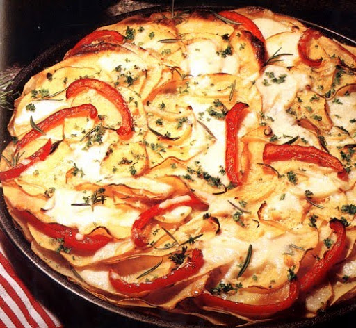 Potatoes star in both the pizza crust and the topping. Rosemary's the herb of choice, and the layers of potato slices are graced with assertive provolone and Parmesan cheeses.