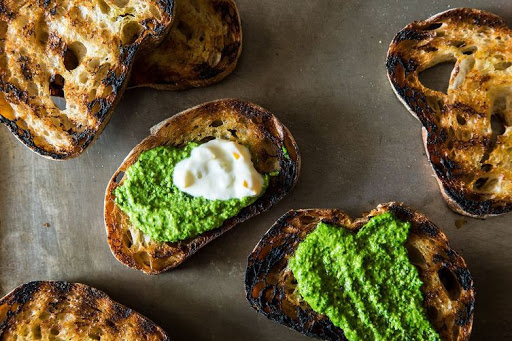 Spread each slice of bread with the pesto, and top with a generous smear of preserved lemon cream. Enjoy!