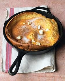 In a blender, combine eggs, milk, flour, salt, vanilla, and 1/4 cup sugar. Blend until foamy, about 1 minute. Pour batter into skillet; bake until pancake is puffed and lightly browned, about 20 minutes.