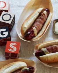 Arrange the hot dogs on a rimmed baking sheet and bake in the upper third of the oven until the bacon is crisp, about 12 minutes. Place each hot dog in a bun and serve, passing the horseradish sauce on the side.