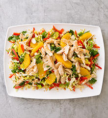 5. Toss romaine, cabbage, bell peppers, cilantro, peanuts, and scallions with remaining vinaigrette in large bowl. Transfer to serving platter and top with chicken and oranges. Serve.