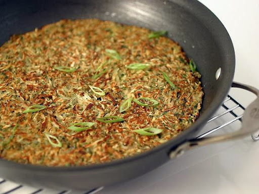 Heat a large (12-inch) nonstick skillet over medium heat and brush the skillet with about half the oil. Add the potato mixture and form into an even cake by pressing lightly with a spatula. Cook, shaking the pan periodically to prevent sticking, until the hash browns are crisp and brown, about 10 minutes.