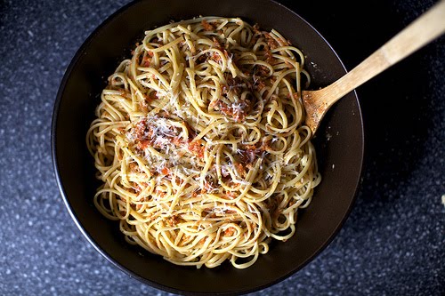 Cook your linguine until it is al dente and could use another minute of cooking time. Reserve one cup of pasta cooking water and drain the rest. Immediately toss the hot linguine with the pesto and mix quickly so that it drinks the sauce up a bit. Add more pasta water if needed. Serve this lukewarm, or at room temperature, with a glass of wine, after you get the baby to bed.