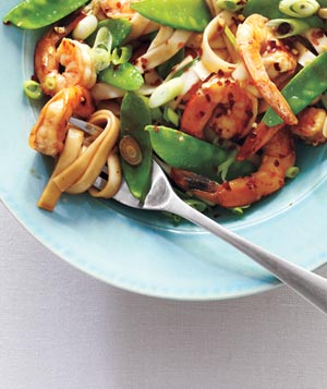 Meanwhile, heat the oil in a large skillet over high heat. Add the shrimp, snow peas, scallion whites, garlic, and ½ teaspoon salt. Cook, tossing occasionally, until the shrimp are cooked through, 2 to 3 minutes.