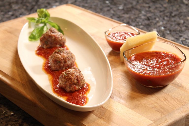Once mixed, roll golf ball sized meatballs and place one inch apart on a baking pan. If using pork in the recipe, there is no need to coat the pan since the pork has more fat that will keep the meatballs from sticking to the pan.