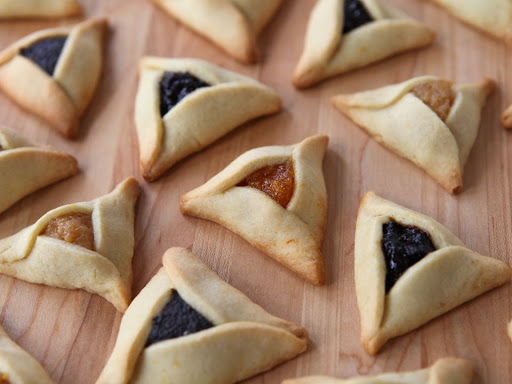14. Assemble the hamantaschen in three steps. First, grasp the left side of the circle and fold it towards the center to make a flap that covers the left third of the circle.Grasp the right side of the circle and fold it towards the center, overlapping the upper part of the left side flap to create a triangular tip at the top of the circle. A small triangle of filling should still be visible in the center.Grasp the bottom part of the circle and fold it upward to create a third flap and complete the triangle. When you fold this flap up, be sure to tuck the left side of this new flap underneath the left side of the triangle, while letting the right side of this new flap overlap the right side of the triangle. This way, each side of your triangle has a corner that folds over and a corner that folds under-- it creates a "pinwheel" effect. This method if folding is not only pretty-- it will help to keep the cookies from opening while they bake.