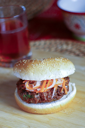 Toast your buns lightly and put some thai sweet chili sauce on the bottom bun before topping it with a turkey burger. Mound some pickled daikon and carrot on the burger and put on the top bun.