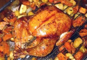 • Crisp jcy rstd chicken w/no fuss. Skin tightens in refrig overnight-seals flavor/moisture. Want to roast all your poultry this way-sce made from chpd vege that serve as bed for chix.