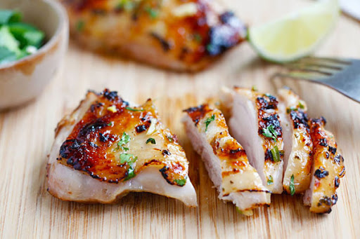 4. Fire up the grill, brush a little bit of oil on the surface. Add a little bit of the garlic, cilantro, and jalapeno from the Marinade on top of the chicken and grill them until they turn golden brown and charred on both sides. Serve immediately.