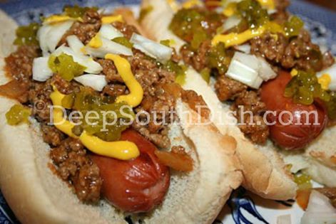 A skillet chili, made for hot dogs and with a Cajun-flair, made with ground beef, seasoned with Worcestershire, yellow mustard, onion, hot sauce, Cajun and other herbs and seasonings.