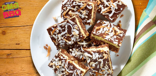 LINE 13x9-inch pan with foil, with ends of foil extending over sides; spray with cooking spray. Microwave 5 oz. chocolate and ½ cup butter in medium microwaveable bowl on HIGH 2 minutes or until butter is melted; stir until chocolate is completely melted and mixture is well blended. Stir in graham crumbs, nuts and 1 cup coconut; press onto bottom of prepared pan. Refrigerate 15 minutes.