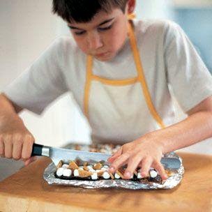Cover and refrigerate the bars until they are firm, about 4 hours. To serve, lift the foil from the pan and set the s'more square on a cutting board. Peel the foil away from the sides, and cut the square into rectangles with a sharp knife. Keep refrigerated until just before serving. Makes 12 bar cookies.