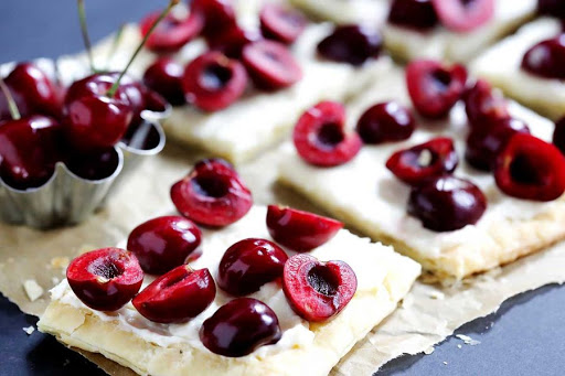 Spread cream cheese mixture on top of puff pastry once it has cooled. Then sprinkle with cherry halves. Slice and serve.