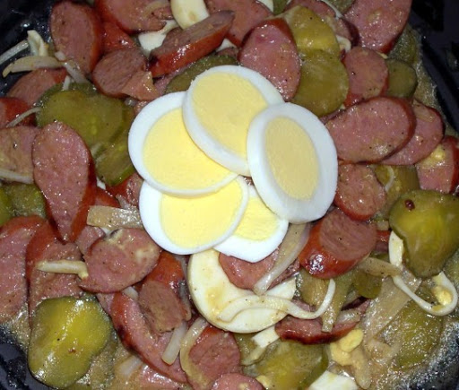 - 4 pre-cooked cold knackwurst of frankfurters, peeled, and sliced thin (about 3/4 of a pound)