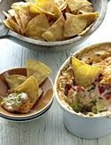 For chips, there are some pretty healthy baked organic tortilla chips on the market, but you can also make your own by cutting up Ezekiel sprouted grain tortillas and baking them in the oven until crisp or dry-roasting them in a frying pan.