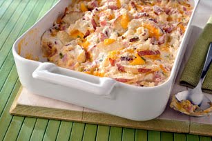 COOK potatoes in boiling water in large saucepan 10 to 12 min. or just until potatoes are tender; drain. Remove 3/4 of the potatoes; place in large bowl. Add sour cream; mash until smooth. Stir in VELVEETA, ham and onions. Gently stir in remaining potato slices.