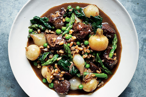 Stir in farro and cook until nearly al dente, 15–20 minutes. Remove herb bundle; add turnips. Cook until farro is cooked through, turnips are tender, and lamb is almost falling apart, 30–40 minutes. Mix in asparagus and peas; cook until crisp-tender, 2 minutes. Add greens and stir to wilt. Season with salt and pepper. Serve drizzled with oil.