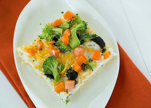 3. In a small bowl, stir together the sour cream and seasoning packet until completely combined. Spread in an even layer over the cooled crust. Top with the shredded cheese and chopped carrots, broccoli and olives. Refrigerate until ready to serve.