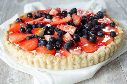 Mix ricotta, cream cheese, confectioners sugar and nutmeg in a bowl with a mixer until smooth. Spread evenly in crust. Spoon strawberries from glaze over the filling. Arrange the sliced fresh strawberries on top of the filling and around the softened strawberries. Scatter fresh blueberries around the top of tart. Brush strawberries and blueberries with remaining glaze.