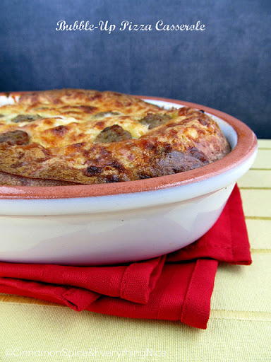 If using link sausage slice into bite size pieces and set aside a few for the top (unless using pepperoni). Add sausage (or beef) back to the pan along with the tomato sauce. Bring to a simmer and cook 10 minutes. Taste and season as needed.