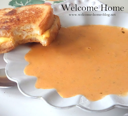 Next add the fresh basil leaves. Next pour soup into blender or use an immersion blender and puree the soup until smooth. If you want the soup to be thinner, add more chicken stock. Taste and adjust seasoning. Last, stir in cream and make a grilled cheese sandwich and enjoy!