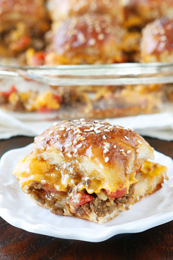 3.Place bottom half of buns in prepared pan. Top with beef & sliced cheese. Finish off with the top half of the bun.