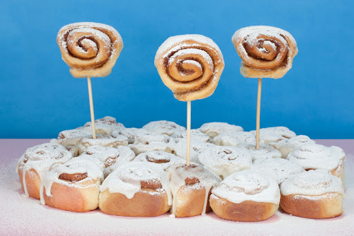 Divide the dough in half and liberally flour the surface of the table or counter. With a rolling pin, roll the dough to a rectangle approximately 16 by 10 inches and 3/4 inch thick. Using a spoon, spread half of the melted butter across the surface. Take half the cinnamon mixture and sprinkle it evenly over the surface. Carefully tuck the bottom (long) edge in and gently roll up the rectangle.