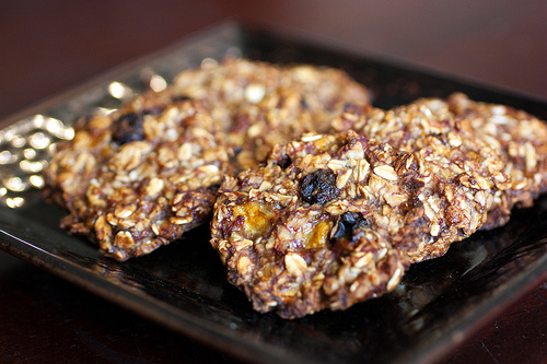4. Drop a tablespoon of banana-oatmeal mixture on a greased cookie sheet and then flatten with the back of a spoon. (Skip flattening if you like soft cookies). To make 16 flat cookies, you’ll need two cookie sheets.