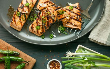 Prepare a grill for medium heat cooking. Using a grill brush, brush the grill grates with canola oil. Remove salmon from the marinade, shaking off any excess. Arrange salmon and peppers on the grill grates. Grill salmon, flipping once, until fish is just cooked through and flakes easily with a fork, about 8 to 10 minutes. (Alternatively, wrap each fillet in foil to form a packet and grill for 20 to 25 minutes.) Grill peppers, flipping frequently until soft and evenly charred, about 8 minutes. Slice and scatter over the top of grilled salmon and serve.