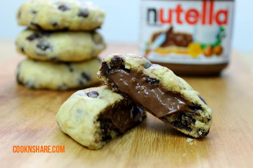 Scoop out about a tablespoonful of the batter and flatten it out into the palm of your hand. Add about ½ a teaspoon of Nutella into the center. Gently fold the cookie dough back up so it entirely seals and covers the Nutella.