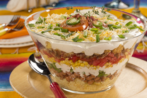 Crumble half the corn muffins into a large glass bowl or trifle dish. Place a layer of beans over corn muffins, then bell pepper, dressing mixture, corn, tomatoes, bacon, remaining corn muffins, dressing mixture, cheese, and scallions.