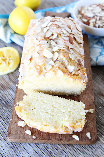 6. While the bread is cooling, make the lemon glaze. In a small bowl, combine powdered sugar, lemon juice, and almond extract. Whisk until smooth. Drizzle the glaze of the lemon almond bread. Sprinkle sliced almonds over the bread. Cut and serve.